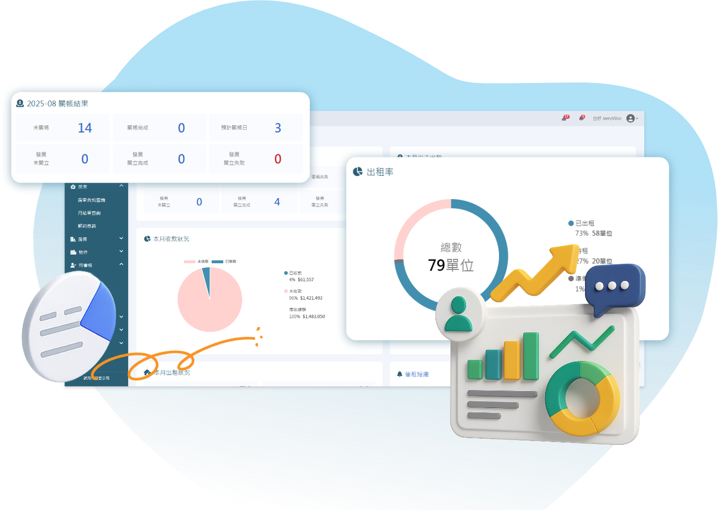 合約 ➜ 收租 ➜ 發票 ➜ 月結,全流程系統代勞,告別人工抄寫與 Excel。